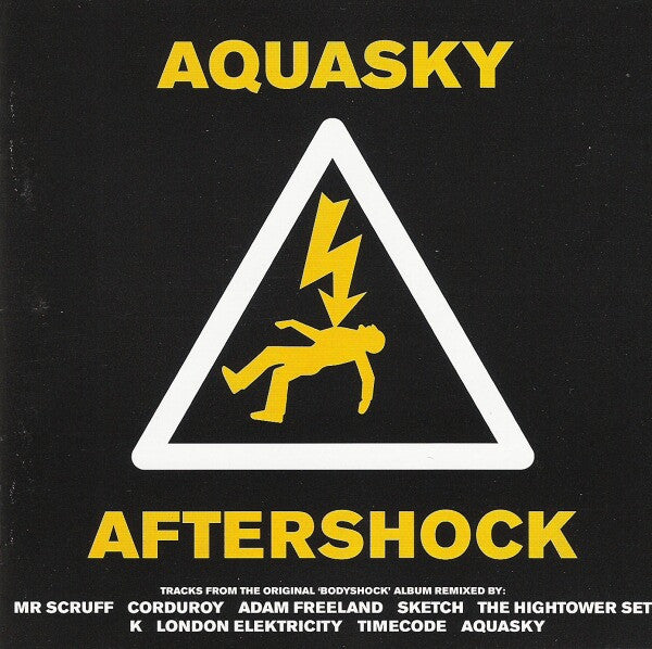 Published by Moving Shadow Music Ltd. ℗&© 2000 Moving Shadow Ltd. Made in England. From the booklet: 'Aftershock' is the follow-up to Aquasky's excellent debut 'Bodyshock'. This album is made up entirely of remixes of Bodyshock tracks. Track 11, "Bodyshock (Adam Freeland Remix": Vocals sampled from "Insight Magnificent" by [a17600, courtesy of Jazz Fudge Recordings / Westbury Music The tracklisting in the booklet and the backsleeve is printed in the wrong order. It is printed as: 1. Bodyshock (Adam Freeland Remix) 2. Supernatural (K Remix) 3. Suspekt Device (The Hightower Set Remix) 4. Sonix (Sketch Remix) 5. Stalker (Timecode Remix) 6. Battlestar (Corduroy Remix) 7. Bodyshock (Aquasky Remix) 8. Man Made Symphony (Mr Scruff Remix) 9. Zero Tollerance (Aquasky Remix) 10. Rebirth (London Elektricity Remix) 11. Agitator (Aquasky Remix)