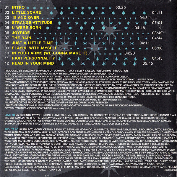 Produced by Benjamin Diamond for Diamond Traxx and Seb K and Cello for Optimo Production. All tracks published by Left Music, except "Joyride" published by Vielklang Musikverlage - BMG Publishing / Left Music / Bastic Editions. "The Rain" published by Juice Up Music. "Joyride" contains a sample of "Hell Or Heaven" performed by L.U.P.O. Mix engineered at Boombastic Boom, NYC. 1 & 11: Recorded at Pigalle Sound, Paris. 2, 4, 5, 9, 10 & 12: Recorded at Studio Epic, Paris. 7: Recorded at Studio Du Flon, Lausanne, and at Studio Plus XXX, Paris. 3 & 8: Recorded at Studio Plus XXX, Paris. Mixed for Optimo Production. 1, 2, 4, 5, 9, 10, 11: Mixed at Pigalle Sound, Paris. 3, 7, 8: Mixed at Studio Harryson, Paris. 12.1: Mixed at Studio Epic, Paris. 12.3: Uncredited bonus track. Mastered at The Exchange. Made in Austria. Distributed in France by Sony Music. ℗ & © 2000 Diamond Traxx.
