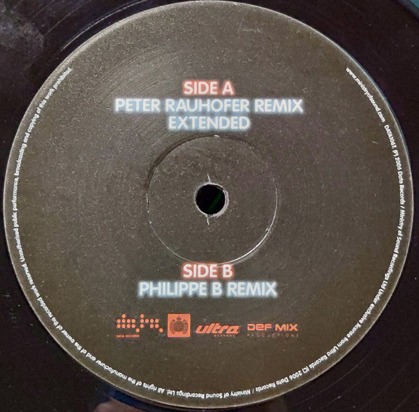"Extended" and "Peter Rauhofer Remix" incorrectly ordered as A2, A1 on the sleeve and labels. (P) 2006 Data Records / Ministry Of Sound Recordings Ltd under exclusive license from Ultra Records. (C) 2006 Data Records / Ministry Of Sound Recordings Ltd.