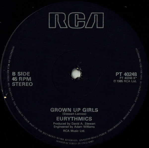 A: This song is specially dedicated to Mr. Stevie Wonder with love and thanks. Taken from the "Be Yourself Tonight" album. There are four variations of the UK 12'' single, all sharing the same barcode. The first has the album mix of There Must Be An Angel on the A side The second (this one) has the original sleeve and catalogue number, but with a sticker on the sleeve, and plays the Special Dance Mix on the A side. The third has a different sleeve and catalogue number, again playing the Special Dance Mix on the A side. The fourth is identical to the third version but does not credit Stephen Marcussen or Precision Lacquer in runouts. All versions play grown Up Girls on the B side. No durations are given on the labels or cover.