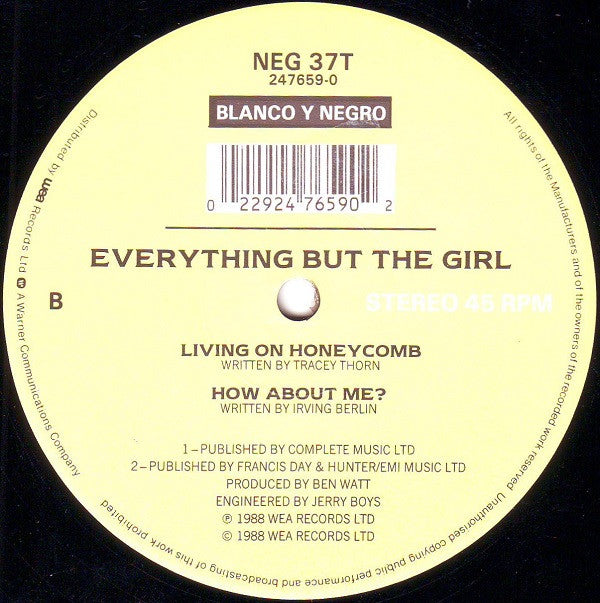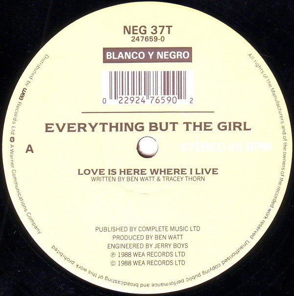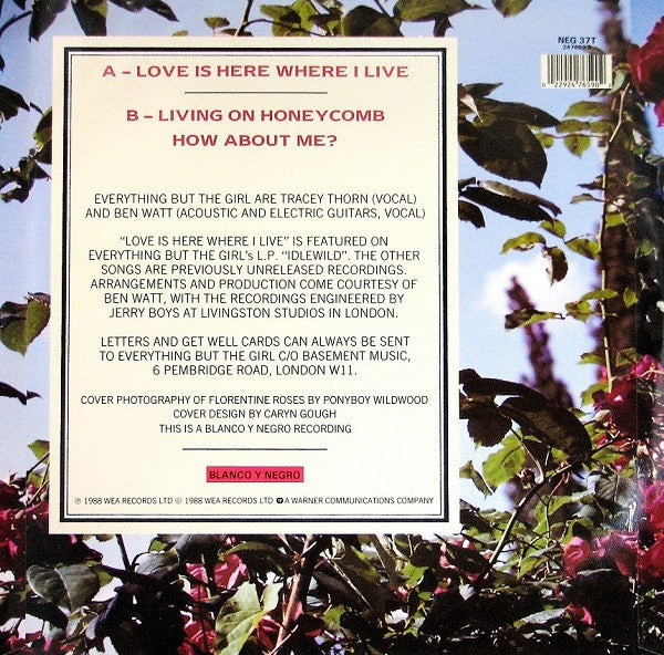 "Love Is Here Where I Live" is featured on Everything But The Girl's L.P. "72558". The other songs are previously unreleased recordings. Recordings engineered at Livingston Studios in London. ℗ 1988 WEA Records Ltd © 1988 WEA Records Ltd A, B1: Published by Complete Music Ltd. B2: Published by Francis Day & Hunter / EMI Music Ltd Direct Metal Mastering