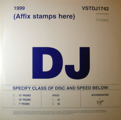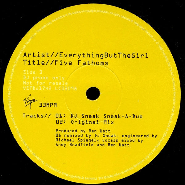 Cover states 45 rpm, but all sides are 33 ⅓. Track// Club 69 Future Club Mix Remix and additional production for Unique Productions Track// Kevin Yost Everything And A Groove Mix Remix and additional production for Trio Productions Kevin Yost appears courtesy of i! Records Track// Kevin Yost Enlightenment Mix Remix and additional production for Trio Productions Kevin Yost appears courtesy of i! Records Published by Sony/ATV Music Publishing Ltd. The copyright in this sound recording is owned by Everything But The Girl, and is exclusively licensed to Virgin Records Ltd. This label copy information is the subject of copyright production. All rights reserved © 1999 Virgin Records Ltd. © 1999 Everything But The Girl, exclusively licensed to Virgin Records Ltd. ℗ 1999 Everything But The Girl, exclusively licensed to Virgin Records Ltd.