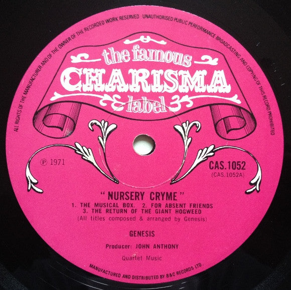 1st UK press Charisma "Pink scroll" label Non laminated, outer textured gatefold cover. Sleeve: Recorded at Trident Studios, London. Manufactured and distributed by B&C Records Ltd. 37 Soho Square, London W1. (01734 3932) Printed and made by the E. J. Day Group, London and Bedford. Label: ℗ 1971 Quartet Music Manufactured and distributed by B&C Records Ltd. Note: Cut credit for this LP is derived from the "Hiltop" etching in the A-side runout. The '1U/2U' stampers indicate a Gramophone Co. Ltd. contract pressing.