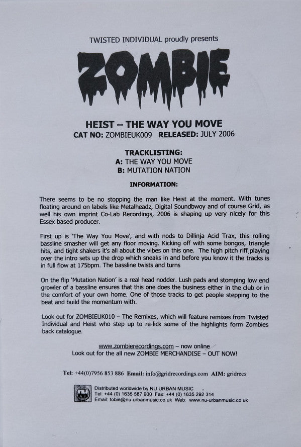 Heist - The Way You Move / Mutation Nation ZOMBIEUK009 (12", Promo, W/Lbl) (Very Good Plus (VG+))