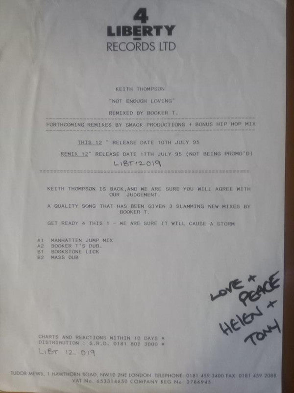 Keith Thompson - Not Enough Loving LIBT 12019 (12", Promo, W/Lbl) (Very Good Plus (VG+))