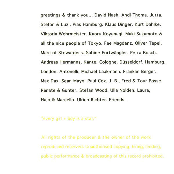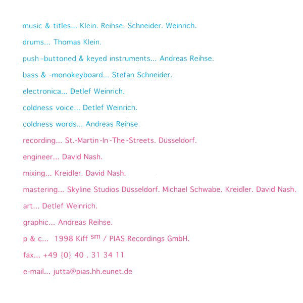 Issued in a clear tray jewel case with a 4-page booklet containing credits. Track durations not listed on the release. Recorded at St.-Martin-In-The-Streets, Düsseldorf. Mastered at Skyline Studios, Düsseldorf. ℗ & © 1998 Kiff ℠ / PIAS Recordings GmbH. Distributed in Germany by Connected. Catalog number: 'Kiff 011' on booklet, 'Kiff 011 CD' on spine, rear cover and CD label.