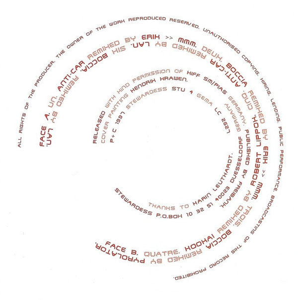 The booklet contains the artwork from the labels of the 12" release. The tracks are remixes of the 1995 Mini-LP 'SPORT' and the 1996 Single 'KOOKAI', both released on Stewardess. P+C 1997 Stewardess The catalogue number is printed as "STU 04" and "Four" on the back sleeve but as STU 4 in the booklet.