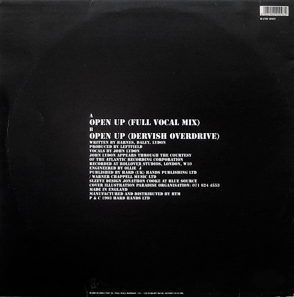 John Lydon appears through the courtesy of the Atlantic Recording Corporation Recorded at Rollover Studios London, W10 Published by Hard (UK) Hands Publishing Ltd / Warner Chappell Music Ltd Made in England (Printed on sleeve) Made in Great Britain (Printed on labels) Manufactured and Distributed by RTM P & C 1993 Hard Hands Ltd Track durations are not listed on the release. Some copies included a Hard Hands merchandise offer postcard. Track A titled "Open Up (The Vocal Mix) on label. Sleeve Design Jonathon Cooke At Blue Source There is also a second pressing in die-cut black sleeve - [r7238756.