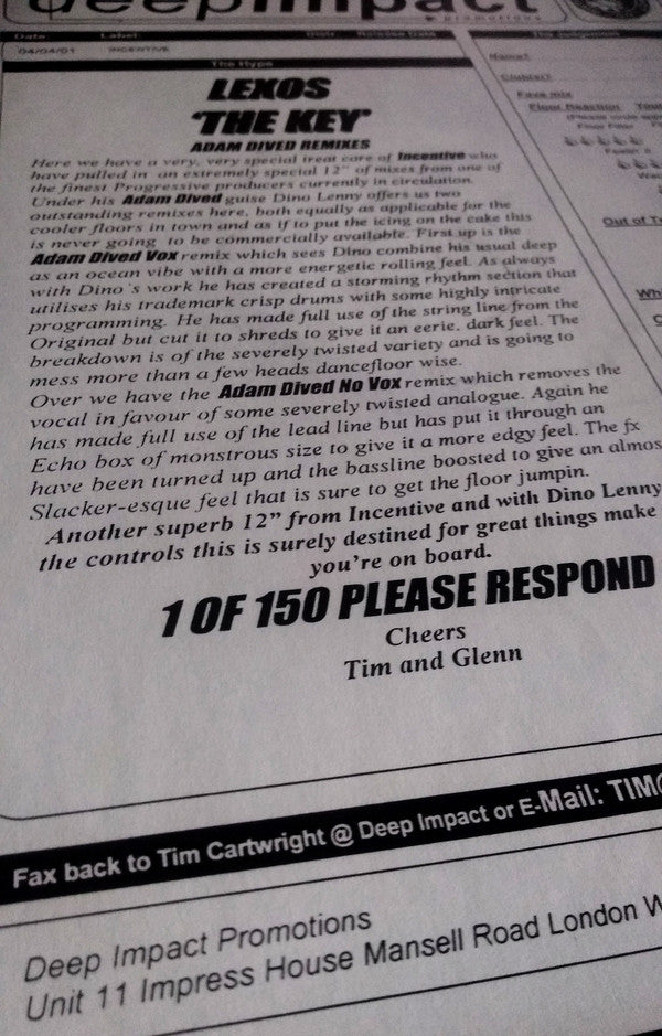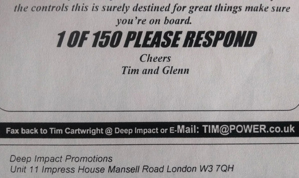 Deep Impact Promotions sheet included, states: Date: 04/04/01. Label: Incentive. 1 OF 150 PLEASE RESPOND Never going to be commercially available. "Another superb 12" from Incentive and with Dino Lenny at the controls this is surely destined for great things make sure you're on board." Cheers Tim & Glenn Fax back to Tim Cartwright @ Deep Impact or E-Mail: TIM@POWER.co.uk Deep Impact Promotions Unit 11 Impress House Mansell Road London W3 7QH Tell: 0208 932 3030 Fax: 0208 932 3031