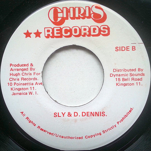 Side B only lists musicians Sly & D. Dennis on center label which usually indicates 'Version' but, in fact, includes an as yet unidentified vocal track by [a161018 on a different riddim.