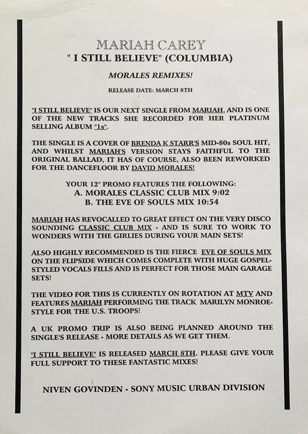 Mariah* - I Still Believe (David Morales Mixes) XPR 2464 (12", Promo) (Very Good (VG))