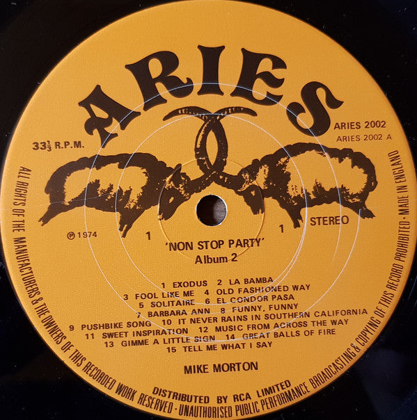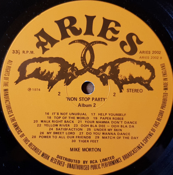 Printed on frontcover: As seen on T.V. Printed on backcover: A1: Chappell & Co. A2: Latin American Music A3: Tic Toc Music SA A4: Chappell & Co. A5: Kirshner/Warner Bros. A6: Pattern Music A7: Planetary-Nom Ltd. A8: Phil Wainman/April Music A9: Leon Henry/Carlin Music A10: Rondor Music A12: Interson/GGEMA [sic A13: United Artists A14: Carlin Music A15: Carlin Music B1: Valley Music B2: Valley Music/BIEM B3: Rondor Music B4: Leeds Music B7: Gale Music B8: Northern Songs B9: Mirage Music B10: Chappell & Co. B11: Copyright Control B12: ATV Music B13: Big Secret Music B15: Cinnichap/Rak Pub. Ltd. Tracks A11, B5, B6, B14 not listed on back cover. Manufactured and Distributed by RCA, Limited, Record Division, RCA House, Curzon Street, London, W.1. Printed in England by Robert Stace & Co Ltd Another Mike Morton L.P. you will enjoy Mike Morton - Non Stop Party Show Printed on label: Title: Non Stop Party - Album 2 Made in England ℗ 1974 Distributed by RCA Limited Side A: Track A3 is titled as: Fool Like Me Track A4 is titled as: Old Fashioned Way Track A15 is titled as: Tell Me What I Say Side B: Track B8 is titled as: Ooh Bla Dee - Ooh Bla Da Track B9 is titled as: Satisfaction Track B9 is titled as: Under My Skin