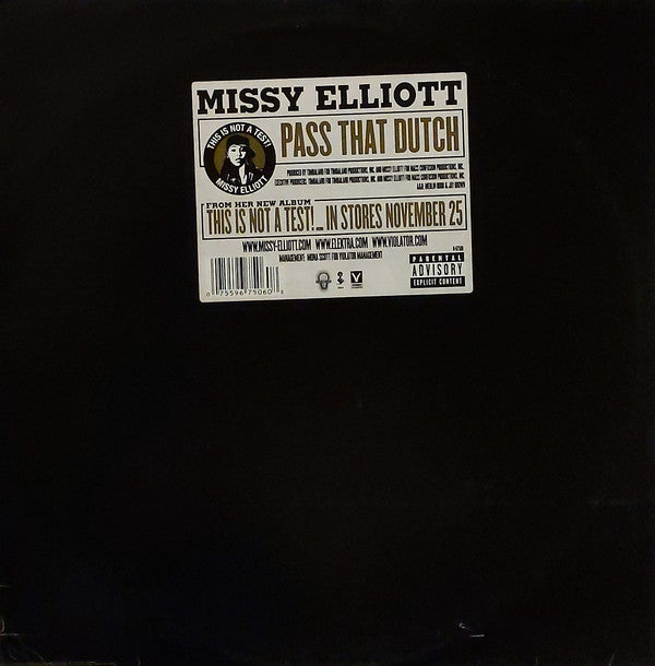 Pass That Dutch produced by Timbaland and Missy Elliot for Mass Confusion Productions Recorded at Hit Factory Criteria Miami, FL Mastered at The Hit Factory, NY ℗© 2003 Elektra Entertainment Group Inc. Warner Music Group, an AOL Time Warner Company. From her new album This Is Not A Test! Issued in a plain black cardboard sleeve with an information/hype sticker applied to the front.