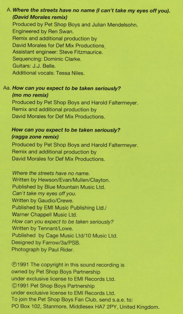 "Where The Streets Have No Name" Published by Blue Mountain Music Ltd. "I Can't Take My Eyes Off You" Published by EMI Music Publishing Ltd./Warner Chappell Music Ltd. "How Can You Expect To Be Taken Seriously?" Published by Cage Music Ltd/10 Music Ltd. ℗ 1991 The copyright in this sound recording is owned by Pet Shop Boys Partnership under exclusive license to EMI Records Ltd. © 1991 Pet Shop Boys Partnership under exclusive license to EMI Records Ltd. Some copies were printed and released with the same label (A) on both sides