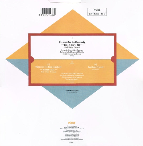 [Sleeve ℗ 1987 Pete Waterman Ltd Original sound recordings made by PWL. BMG Records (UK) Ltd. are the exclusive licensees for the world ©BMG Records (UK) Ltd. 1987. Distributed in the UK by BMG Records Distributed in Europe by BMG/Ariola, a Bertelsmann Music Group Company. Country of manufacture of record as stated on record label. [Labels All Boys Music Ltd. Marketed by RCA Records. Manufactured in England. Track A is a cover version of [m137030.