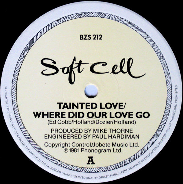 Cover-Version of Gloria Jones – Tainted Love Tracklisting on label and sleeve incorrectly listed as: A: Tainted Love/Where Did Our Love Go AA: Tainted Dub. Copyright Control/Jobete Music Ltd. ℗ 1981 Phonogram Ltd. (Thanks to everyone at the Warehouse.) S.B.L. 292/3 High Street, Lincoln, Lincs. 'Tainted Love' was originally a northern soul stomper, performed by Gloria Jones back in 1965. This pressing has the 7" A-side & B-side versions on the A-side and the full 12' version on the B-side. There is another pressing with the full 12" mix on the A-side and the full dub version on the B-side. Both versions have identical covers and labels.