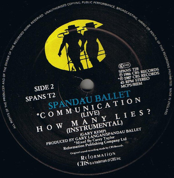 [Back sleeve © 1987 CBS Records CBS is a trademark of CBS Inc Distribution: CBS Records/CBS Disques S.A. Made in England [Labels ℗ 1986 CBS Records ℗ 1987 CBS Records [Track B1 Reformation Publishing Company Ltd Original sound recording made by CBS Records Made in England [Uncredited info Track B1 was recorded at the NEC, Birmingham