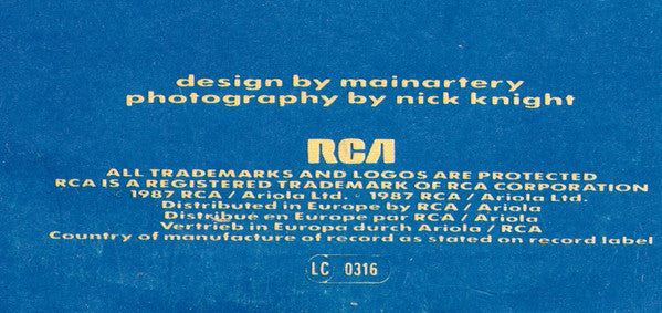 Sleeve info: © 1987 RCA/Ariola Ltd. ℗ 1987 RCA/Ariola Ltd. Distributed in Europe by RCA/Ariola Distribué en Europe par RCA/Ariola Vertrieb in Europa durch RCA/Ariola Labels info: ℗ 1986 RCA/Ariola Ltd. Manufactured in England Month of release from Record Collector Magazine Nov 1994 p.76
