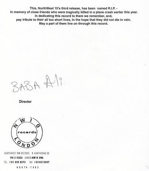 "In memory of close friends who were tragically killed in a plane crash earlier this year. In dedicating this record to them we remember, and, pay tribute to their short lives, in the hope they didn't die in vain. May a part of them live on through this record." - Baba Ali AA side samples lead synth lead from Grace's "Skin On Skin"